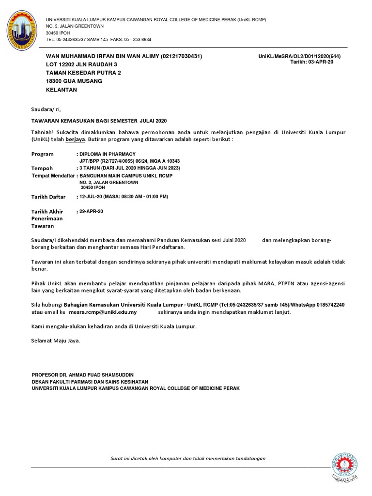 Maklumat lanjut boleh layari httpwwwunikledumy boleh hubungi En Zakaria Abd Hamid - 013-9365008. Bilangan Pelajar Universiti Kuala Lumpur UniKL Bagi Tahun 2013.